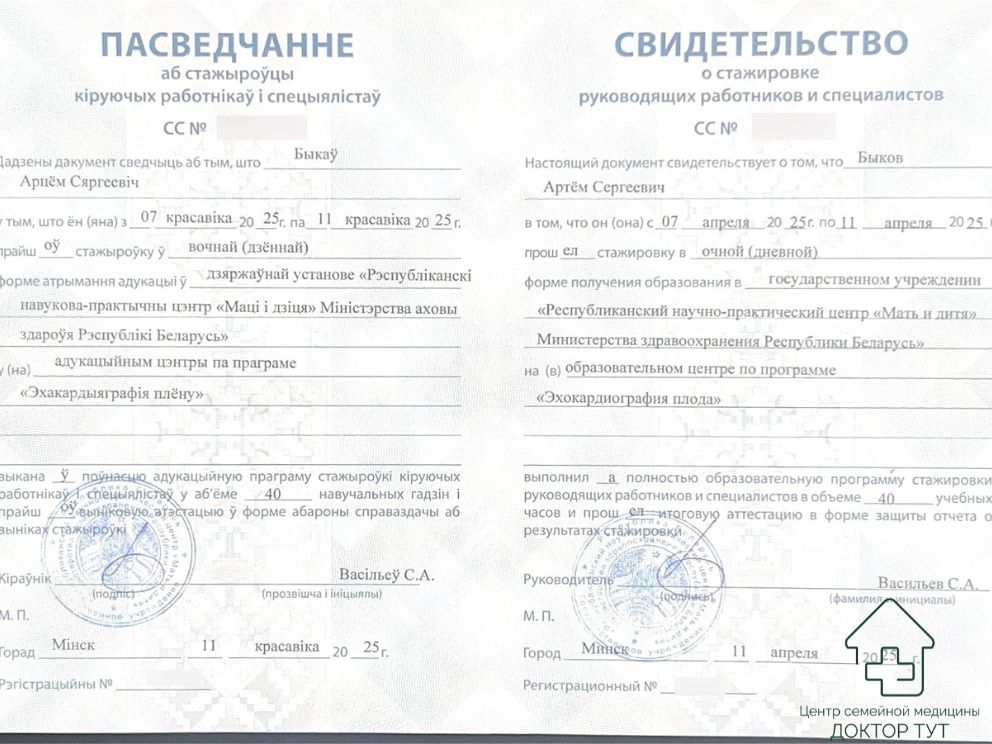 - 2025 Стажировка в ГУ «РНПЦ «Мать и дитя» по программе «Эхокардиография плода»