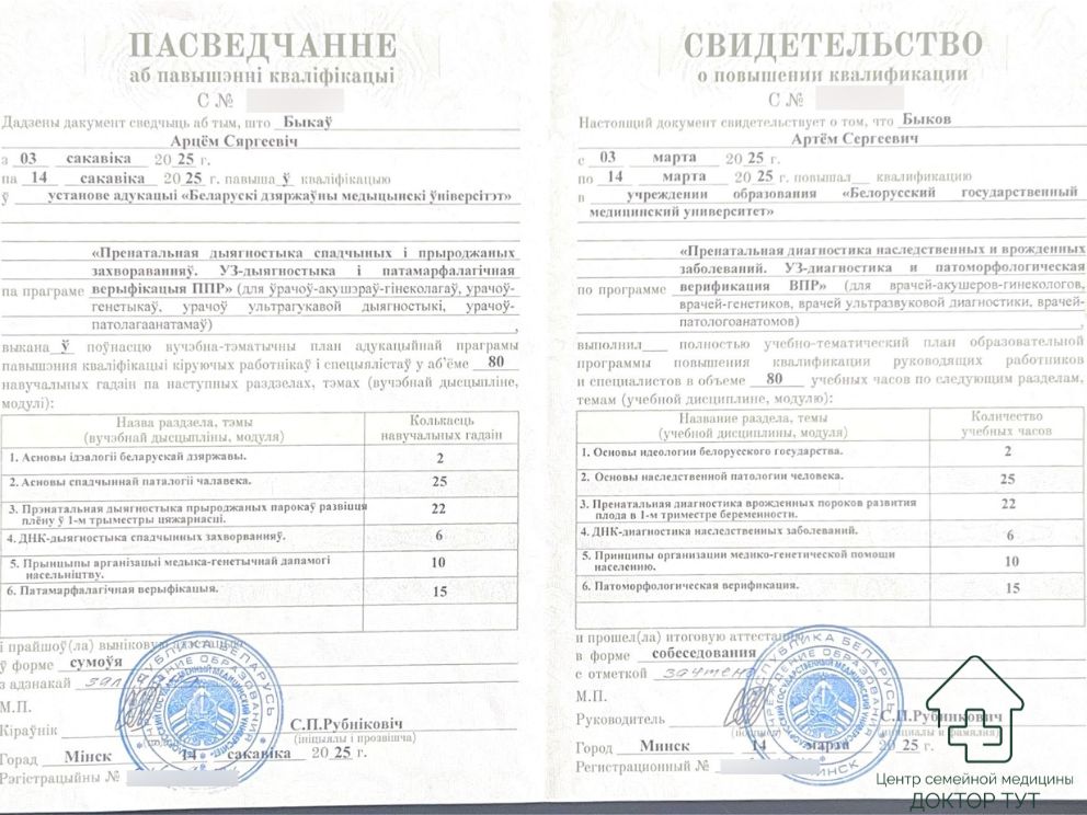 - 2025 Повышение квалификации «Пренатальная диагностика наследственных и врожденных заболеваний. УЗ-диагностика и патоморфологическая верификация ВПР»