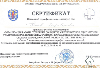 - 2025 Конференция «Организация работы отделения (кабинета) ультразвуковой диагностики. Ультразвуковая диагностика очаговой патологии щитовидной железы по системе TI-RADS, молочной железы по системе BI-RADS»